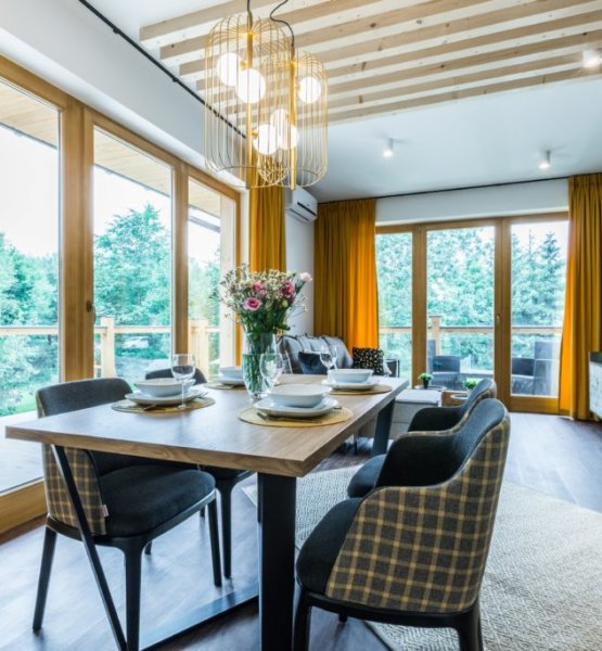 Przestronne wnętrza Rezydencji Diamond, położonej w sercu Białki Tatrzańskiej, z salonem, kuchnią, sypialnią i własnym balkonem zapewniają poczucie prywatności i luksusu.